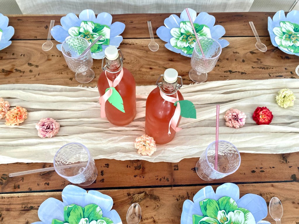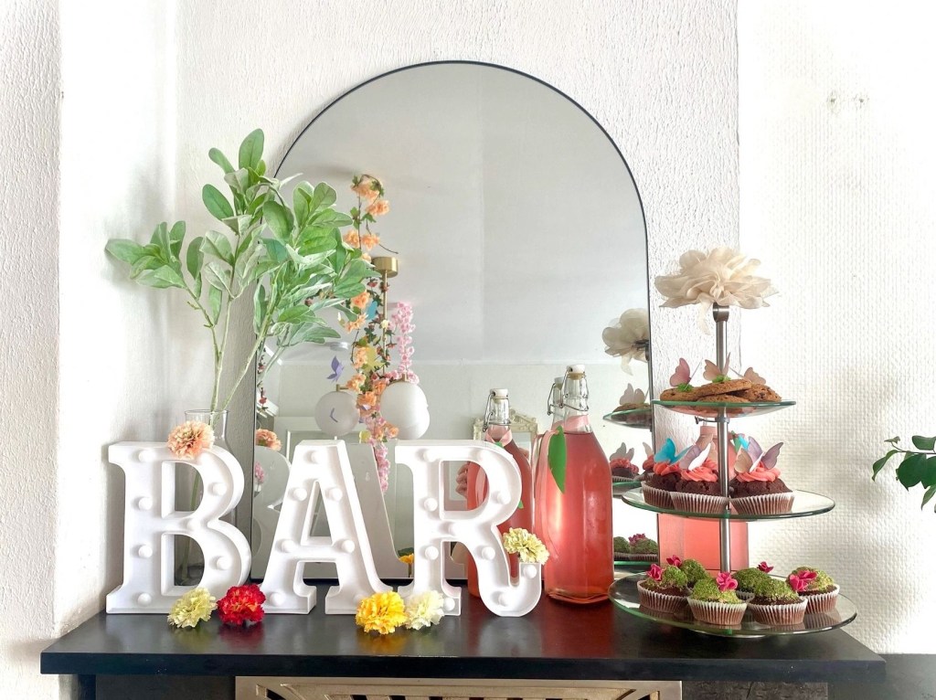 Hva er vel en fest uten en BAR! 🌸Et skilt ble plassert utenfor døren til tross for snø..Stuen ble dekket av sommerfugler og blomster. Noen kjøpt, andre ble klippet ut av farget papir og hengt opp med fiskesnøre. More is more! Very Fairy! 🌸Flaskene ble pyntet med rosa bånd og blader av grønt papir.Hvite duker gjorde trebordet litt lysere sånn at fargene fikk poppe frem. 🌸Nam nam for små feer!Kaker og muffins ble dekket med sopp, spiselige sommerfugler og «mose» laget av kakesmuler som ble farget grønt. 🌸