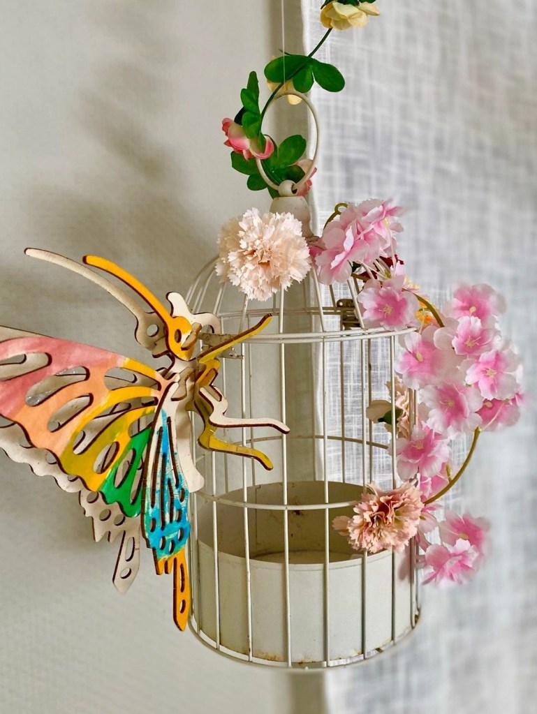 Et gammelt fuglebur ble pyntet med blomster. Sommerfuglen har bursdagsbarnet malt selv. 🌸Invitasjonene som ble delt ut uken før gikk såklart i samme stil!Vi laget invitasjonene av doruller og krepp-papir. Blader av grønt papir. Inn i rullen puttet vi en kjærlighet. 🌸